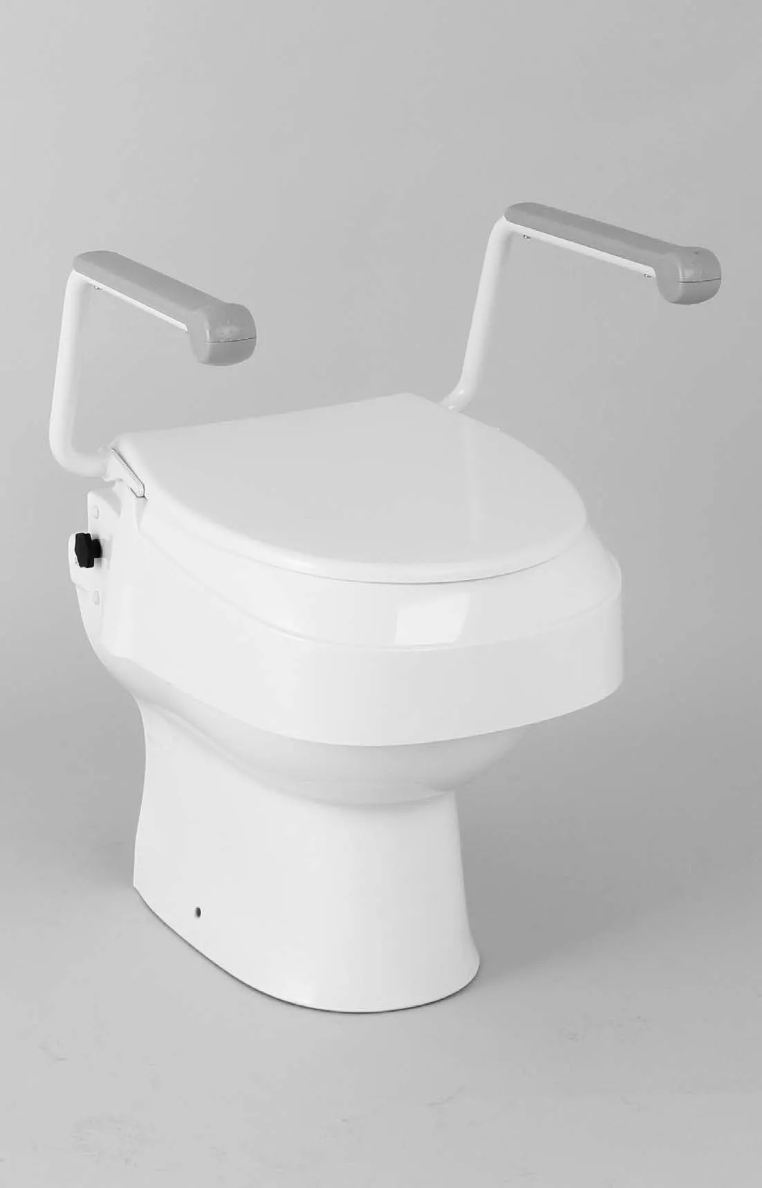 The plastic moulded armrests are removable and height adjustable. The raised toilet seat and stable arms make it easier to sit down on and stand up from the toilet.
