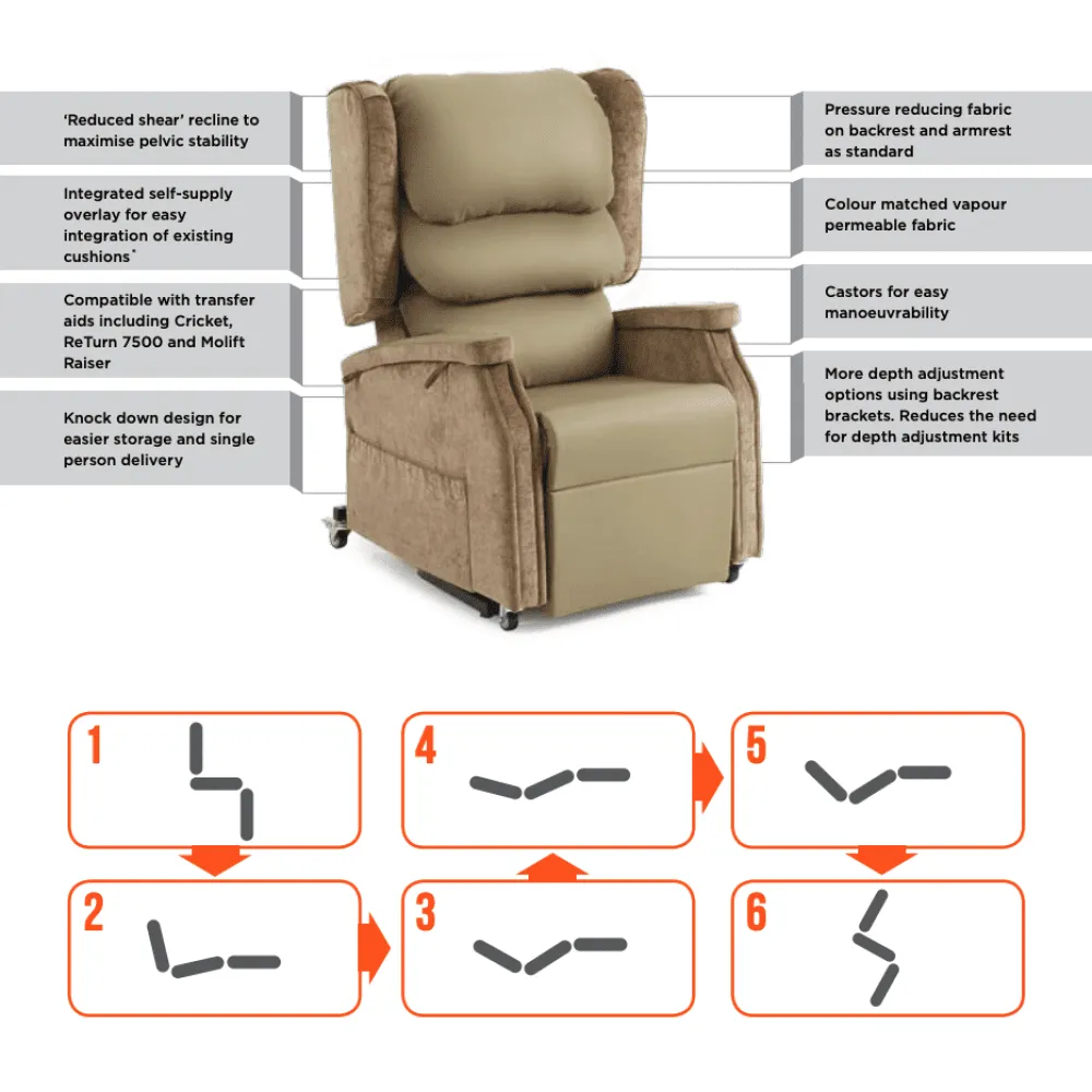 - No-shear backrest recline to retain pelvic stability and minimise skin friction.