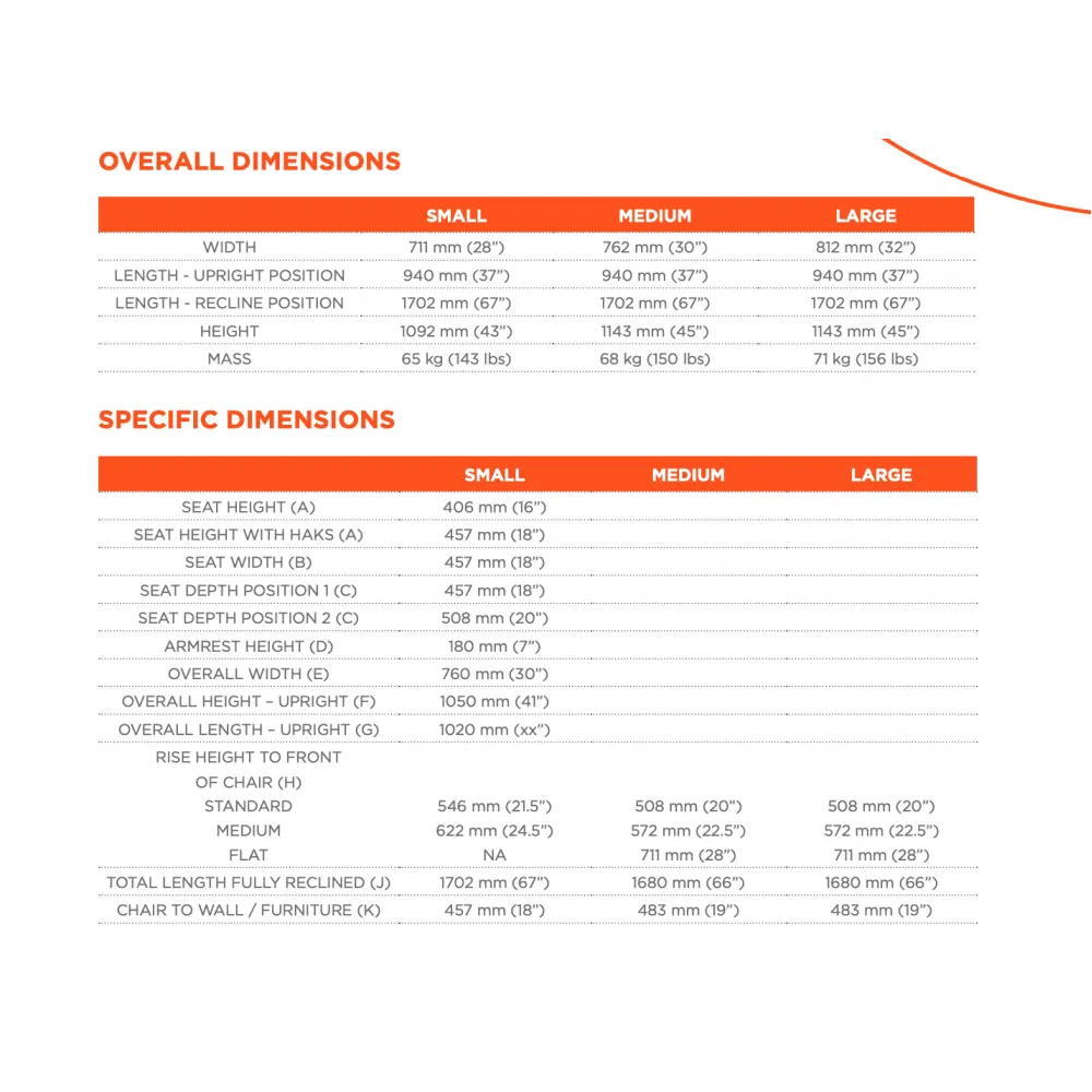 • Seat Depth: 457mm or 508mm