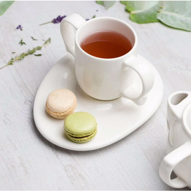 The egg-shaped design of this saucer with raised sides promotes additional safety from spills when being moved or carried. The uniquely designed groove in the saucer allows for the Dignity by Wade drinking mugs/cups to sit securely on the saucer to prevent spills and promote independent drinking. There is plenty of room for a tasty treat on the side. Chip resistant and dishwasher safe. Please note that the cup or mug is not supplied with the saucer. Saucer size: 19cm x 17.1cm x 1.9cm (7½” x 5¼” x 2¾”). Product weighs 490g.