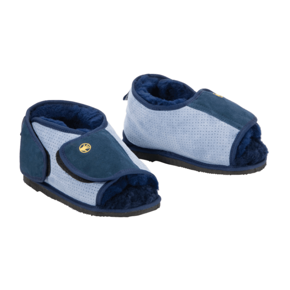 Features a rubber sole for use outside as well as in, plus an open toe for easy toe inspection, toe separation, and air circulation. The hook and loop straps around the heel and across the bridge of the foot allow the shoe to be opened fully and adjusted to ensure that the shoe moulds comfortably to the shape of the foot.