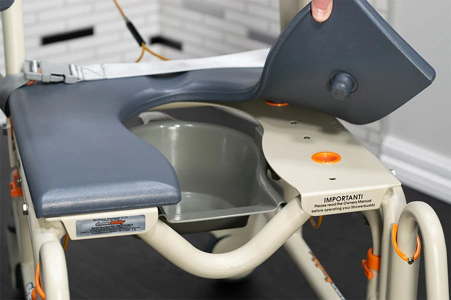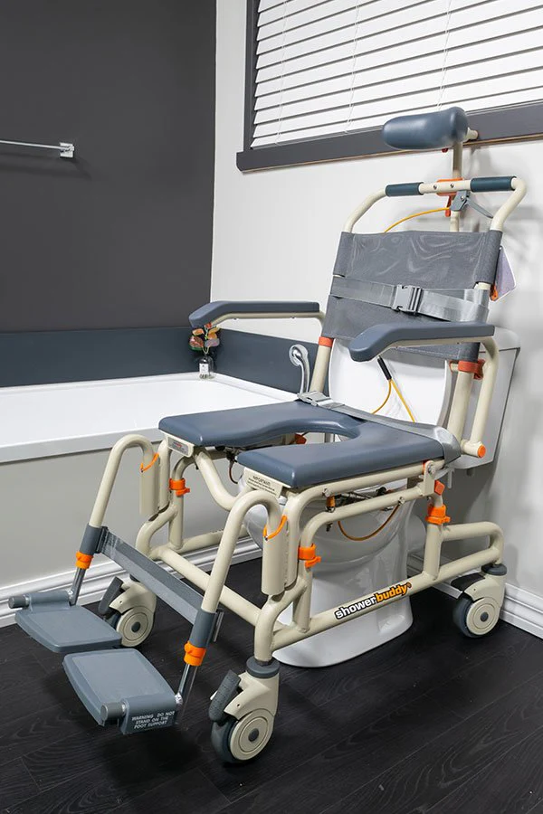 The Showerbuddy Roll-inBuddy Tilt (SB3T) was designed to help carers shower users with greater comfort and ease. Its tilt function is great for alleviating pressure from a seated position, and provides better access during bathing, Thanks to its lightweight frame and locking wheels, SB3T is simple and safe to transfer to and from the roll-in shower at home.