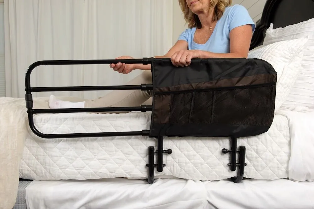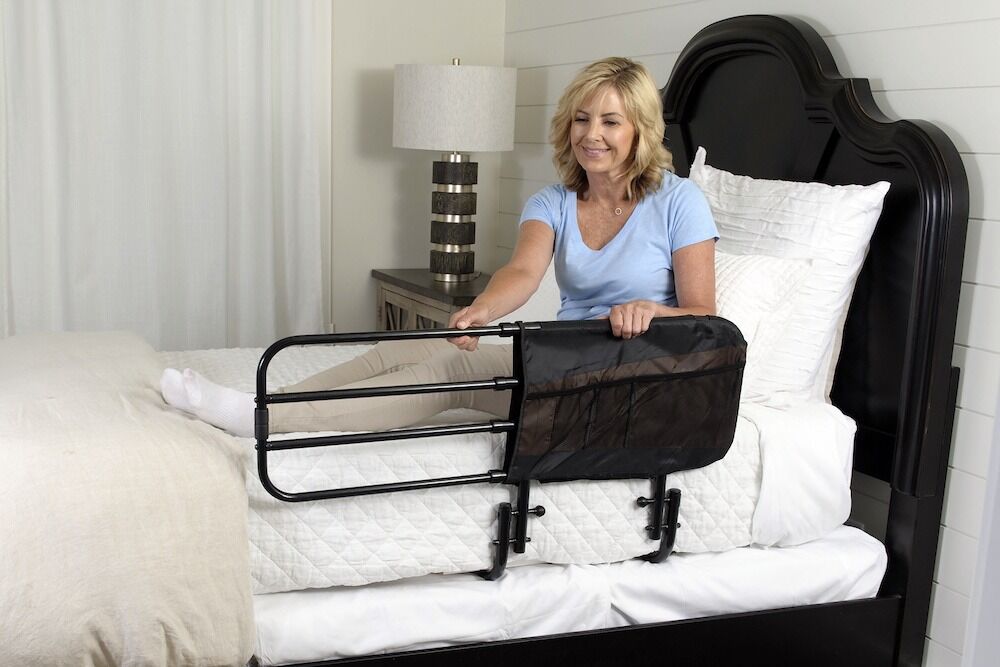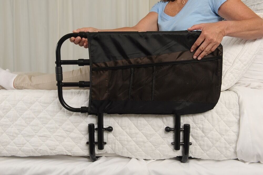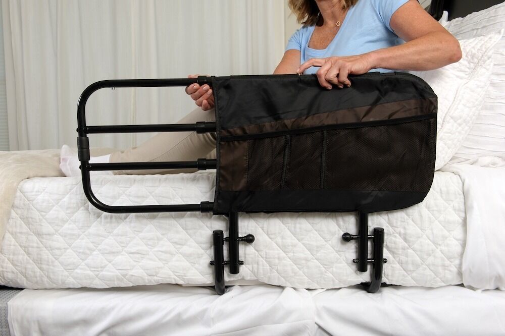 Use the bed rail as a safety handle for balance and support when transferring from bed to a walker, wheelchair, or bedside commode.